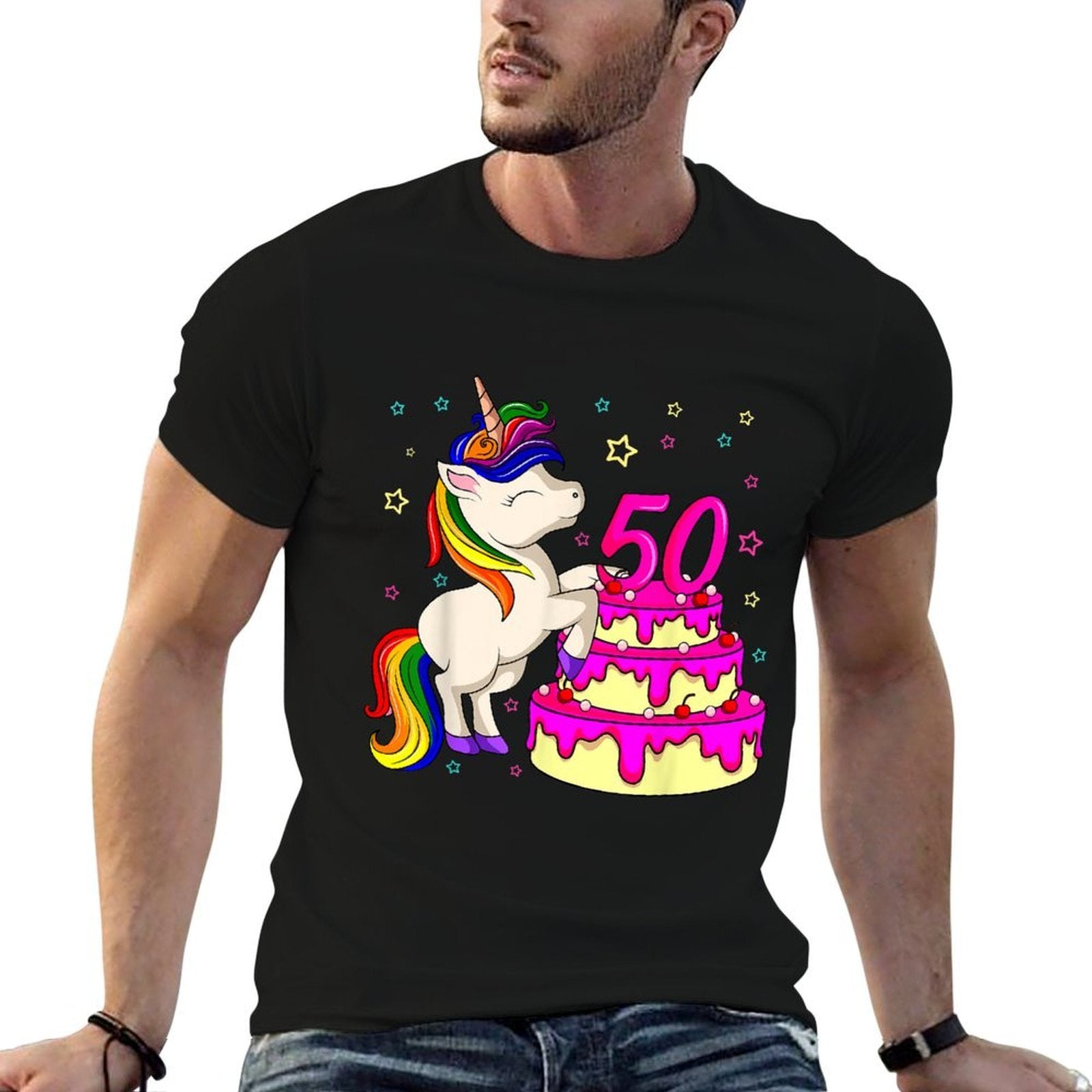 - Avoid bleach to preserve the 50th Bday Unicorn Rainbow Cake Theme Birthday Party T-shirt’s bold graphics and cotton integrity.