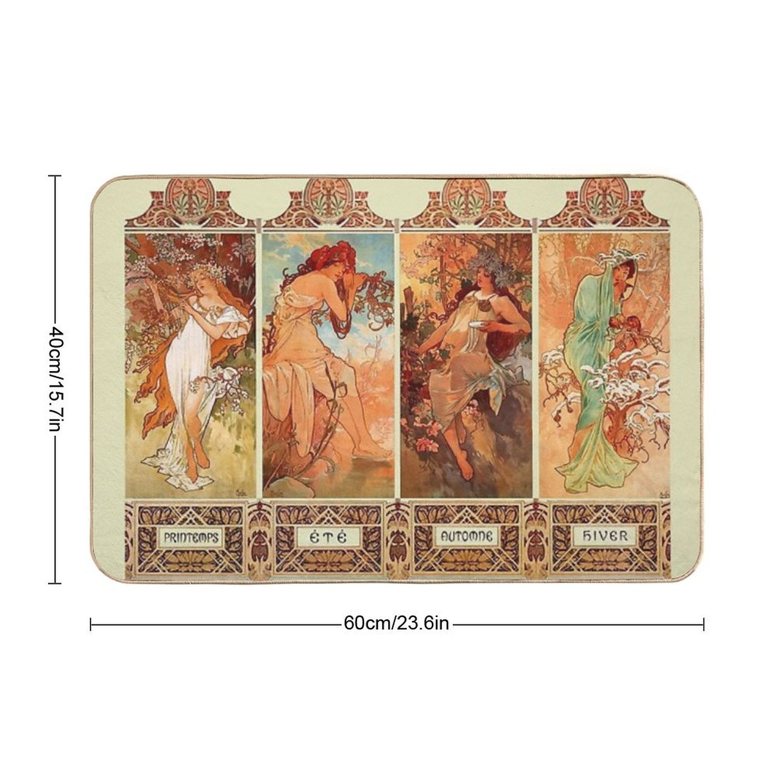 - Use as a vanity rug, guest suite accent, or mudroom defender – the Alphonse Mucha Four Seasons Art Nouveau Mat adapts to any space.