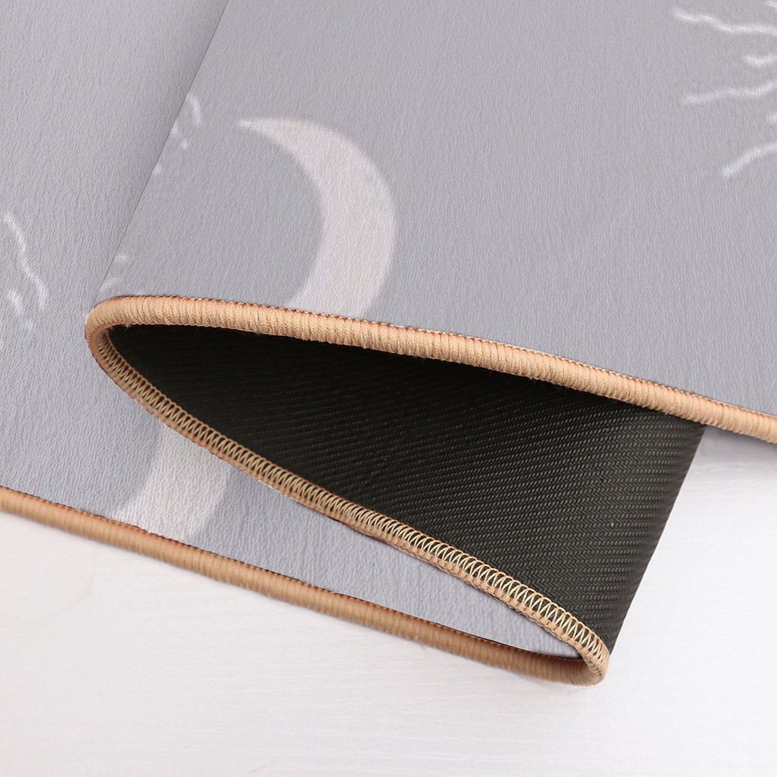 - Non-slip rubber backing grips floors securely, ideal for Cute Sun And Moon Design Boho Aesthetic In Muted Colors Blue Gray Mat placements on tiles, wood, or marble.