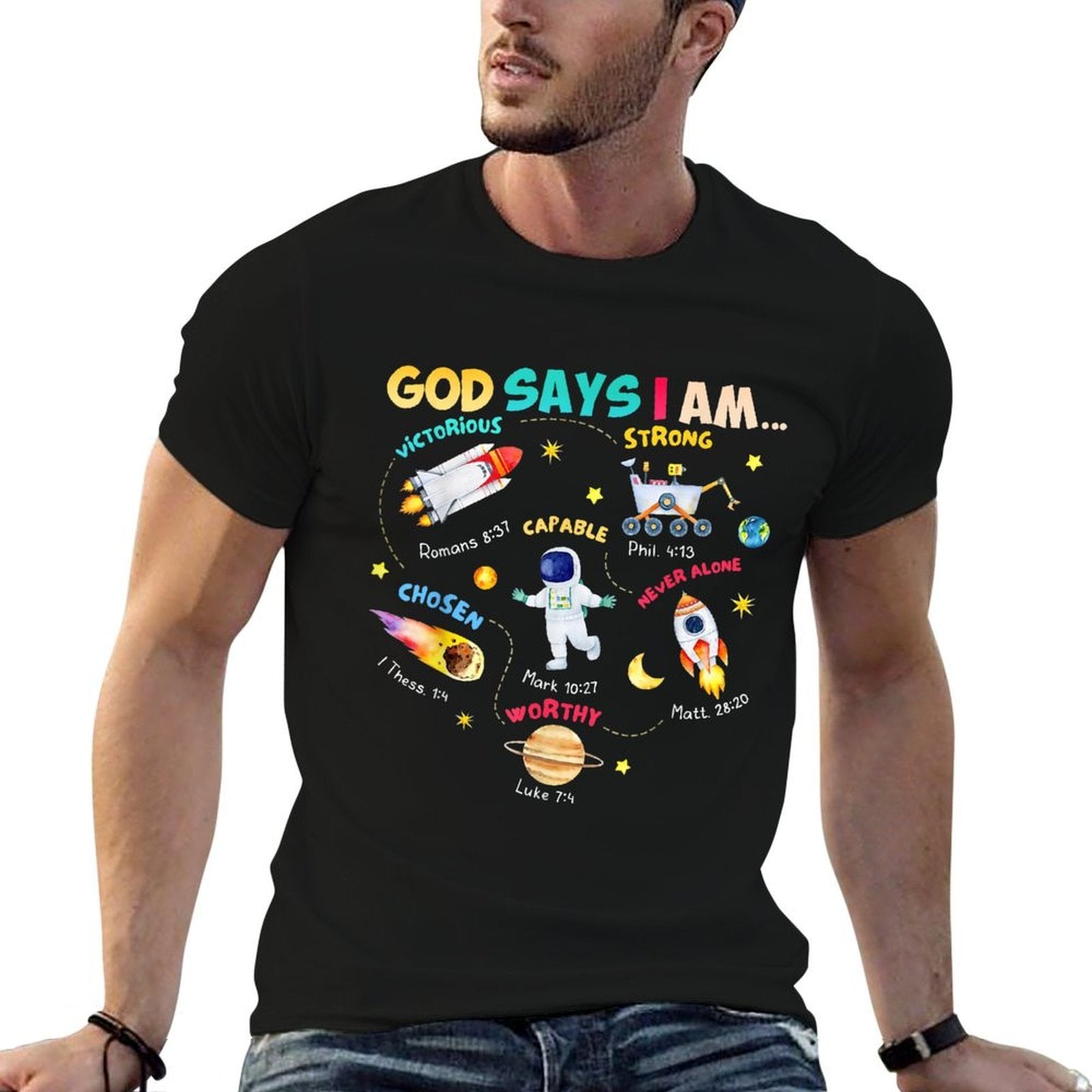 - Care Reminder: Skip soaking and bleach to extend your God Says I Am Outer Space Themed Bible Christian Kids Boys tee’s lifespan.
