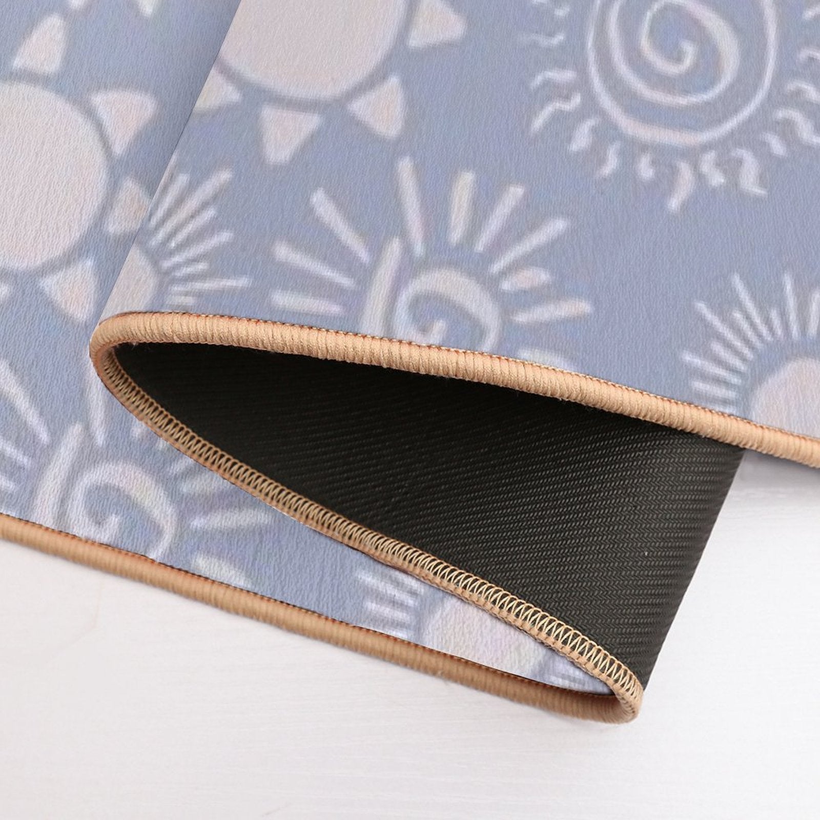 - Non-slip rubber backing grips floors securely, ideal for Magical Sun Bohemian Dreamy Aesthetic In Muted Colors Pigeon Blue Mat placements on tiles, wood, or marble.