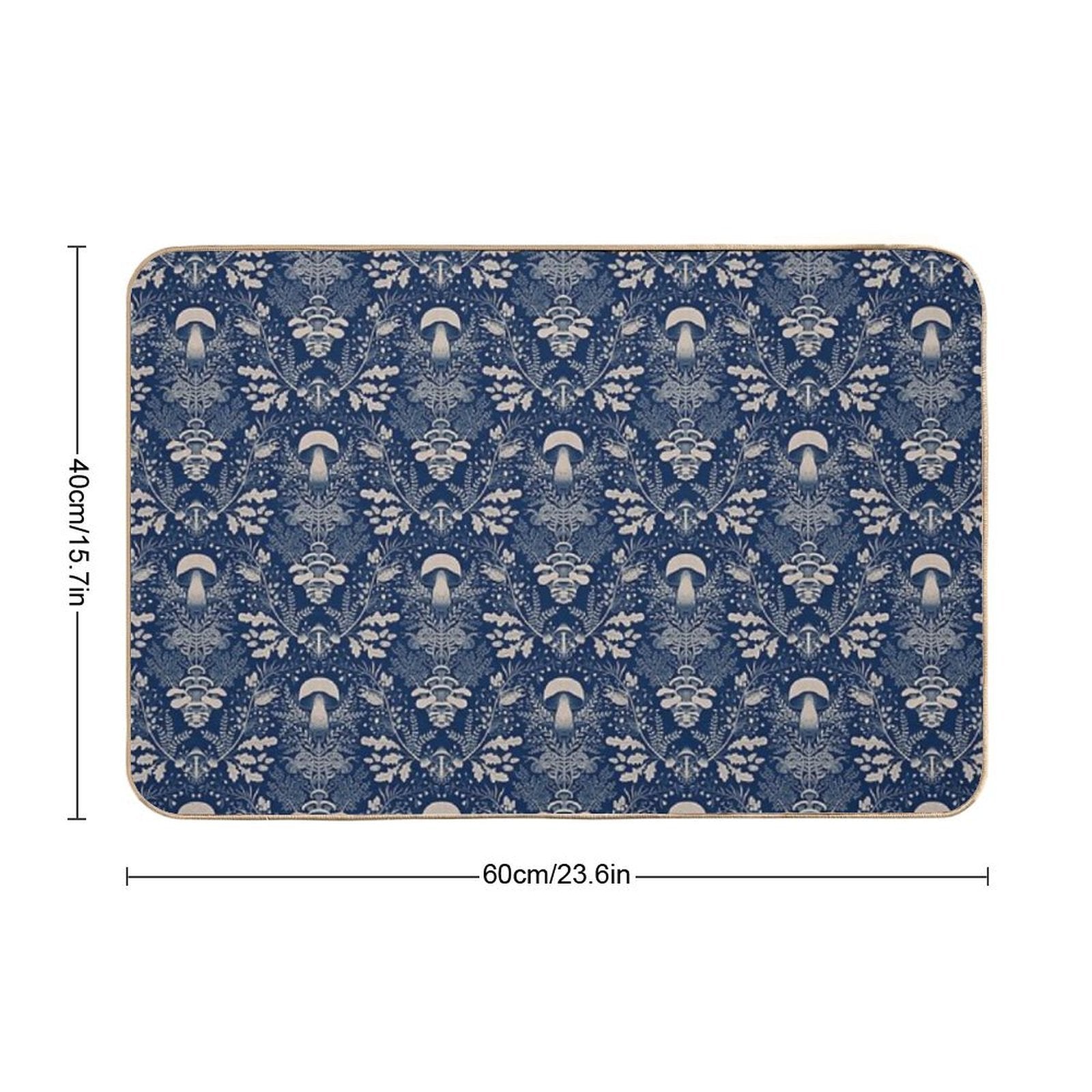 Mushrooms Forest Damask Navy Blue Beige Pet-Safe Bath Mat