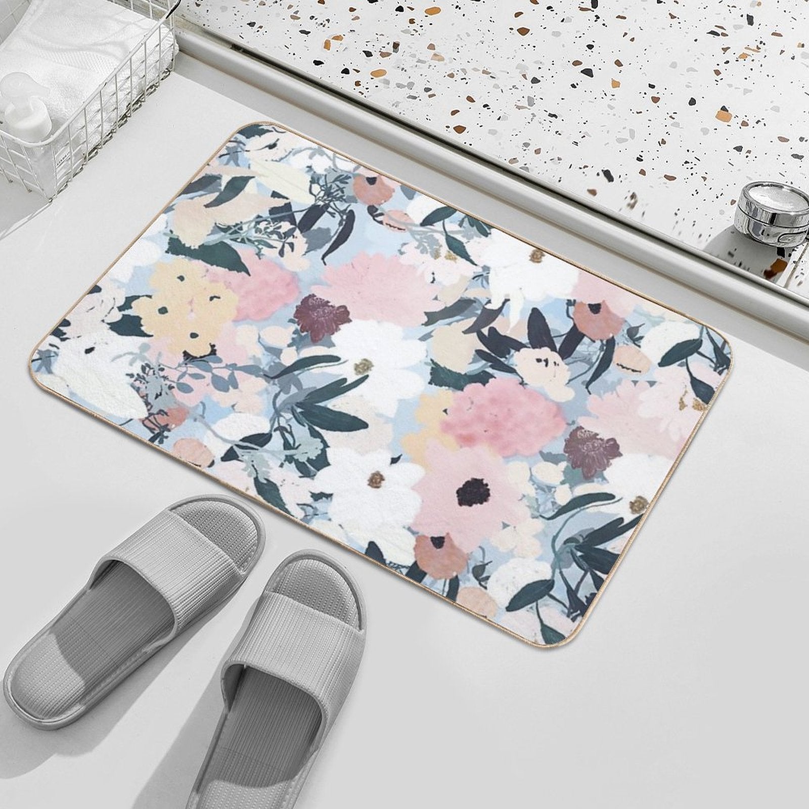 Pink White Floral Watercolor Blue Design Fade-Resistant Bath Mat