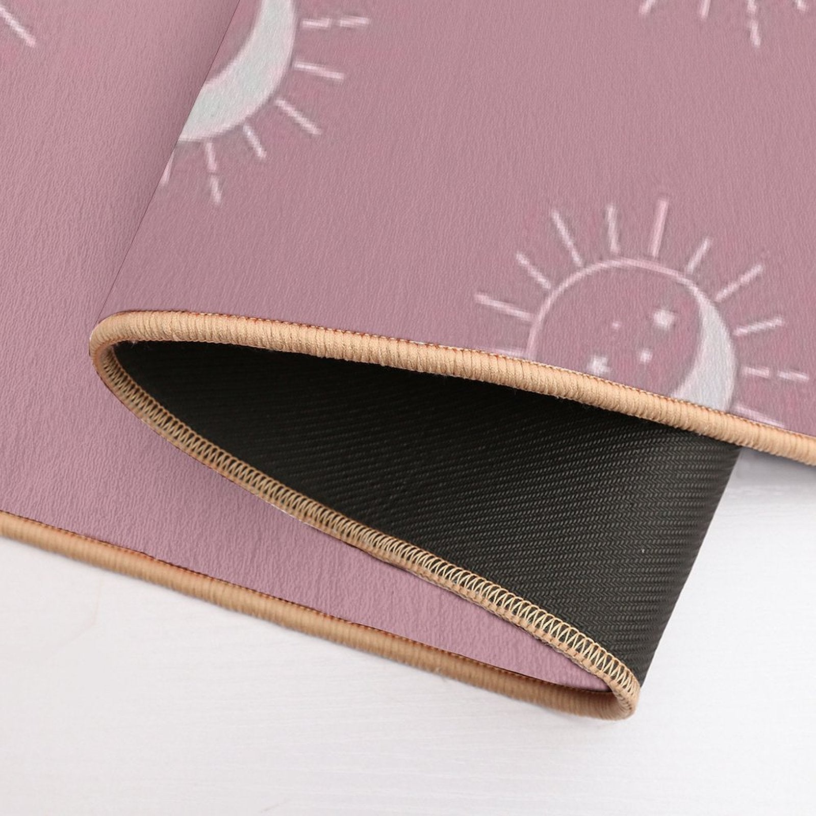 - Non-slip rubber backing grips floors securely, ideal for Pretty Sun And Moon Pattern Soft Aesthetic In Muted Colors Deep Pink Mat placements on tiles, wood, or marble.