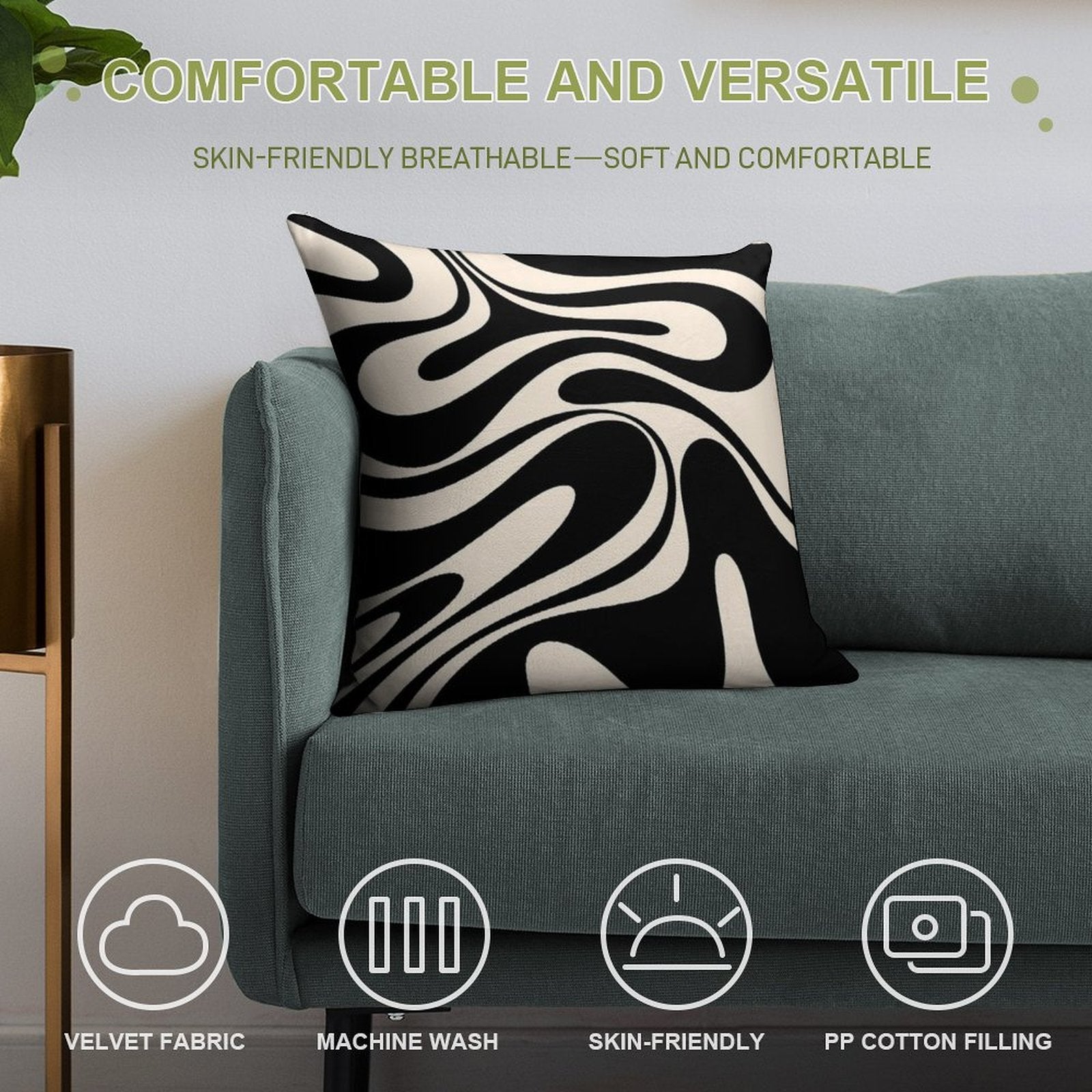 Retro Fantasy Swirl Abstract in Black And Almond Cream Soft Durable Construction Throw Pillow