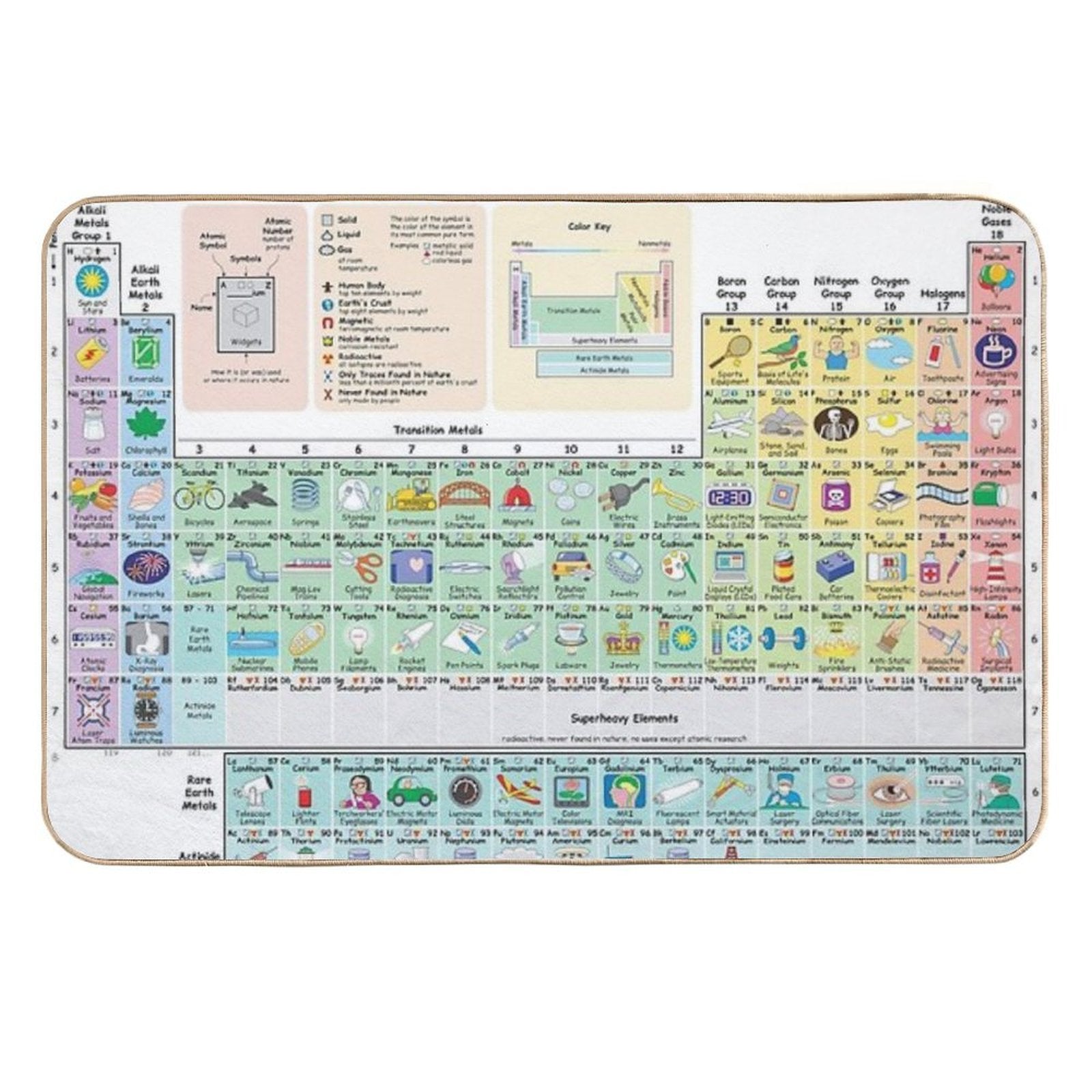 - Non-slip rubber backing grips floors securely, ideal for The Periodic Table of The Elements Showing Daily Use Items in Picture. Mat placements on tiles, wood, or marble.